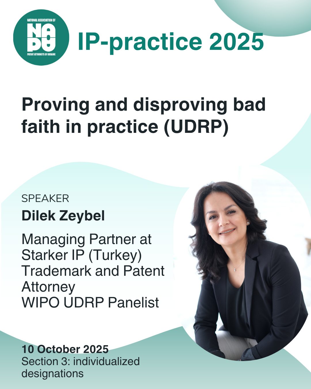 Starker IP olarak gururla duyuruyoruz ki, ortağımız ve WIPO (Birleşmiş Milletlere Bağlı Dünya Fikri Mülkiyet Teşkilatı) Alan Adı Hakemi Dilek Zeybel, Ukrayna Patent Vekilleri Ulusal Birliği (NAPA) tarafından düzenlenen IP Practice Forum 2025 etkinliğine konuşmacı olarak davet edilmiştir.
